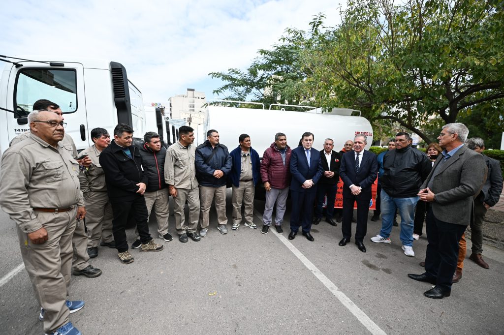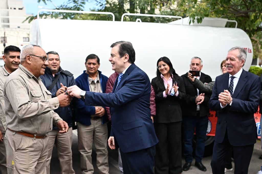 La entrega se llevó a cabo en la explanada de Casa de Gobierno, donde el titular del Poder Ejecutivo estuvo acompañado por el jefe de Gabinete, Elías Suárez; el ministro de Obras Públicas, Aldo Hid; el secretario de Obras Públicas, Jorge Zuaín; el subsecretario de Agua, Sergio Zaltz y el presidente de Recursos Hídricos, Alfredo Montero.