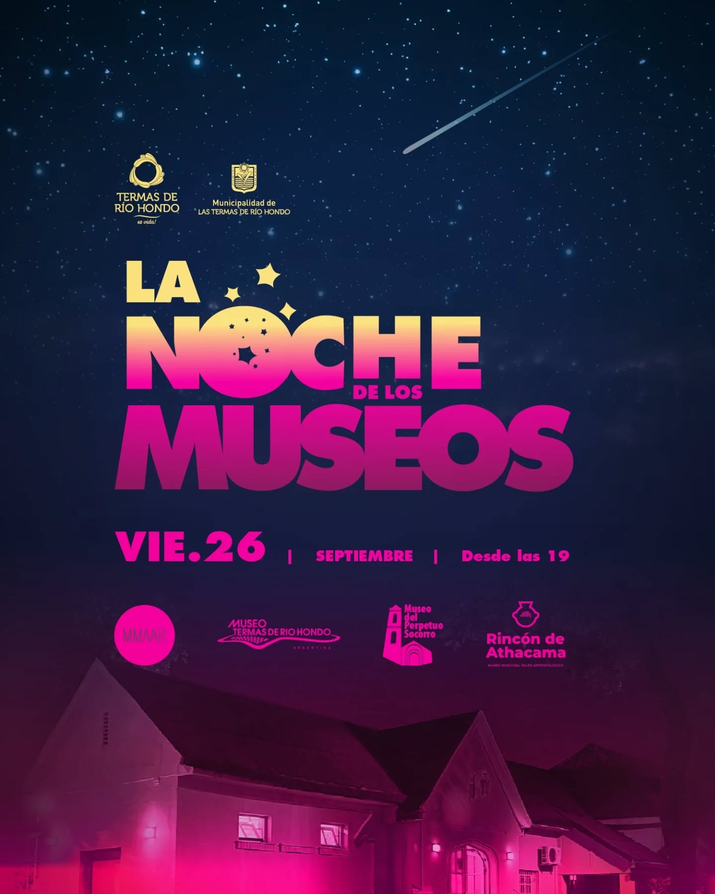 Este viernes 26 de septiembre, desde las 19 hs, la ciudad se viste de cultura con La Noche de los Museos. Vas a poder recorrer el Museo Municipal de Artes Abraham Manlla, el Museo del Perpetuo Socorro, el Museo Rincón de Atacama y el Museo del Automóvil TRH, disfrutando de exposiciones, visitas guiadas, talleres, intervenciones artísticas, música, danza y mucho más.