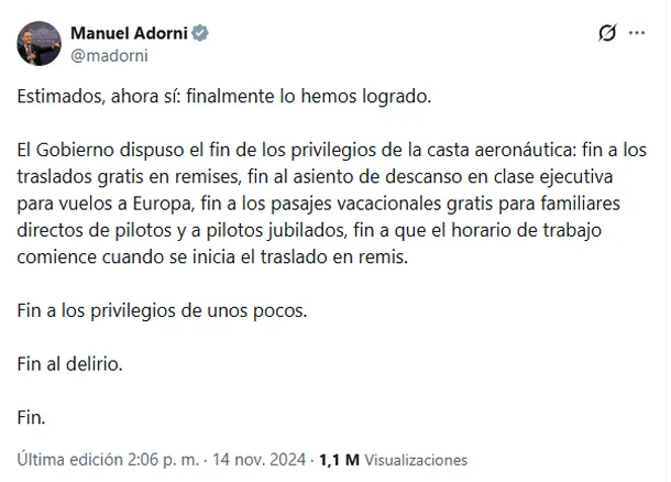 Para entender la doble vara del Gobierno, es necesario repasar qué fue lo que se le recortó a los empleados aéreos. En noviembre de 2024, el propio Adorni celebró en sus redes el fin de los «privilegios de la casta aeronáutica», festejando la eliminación de los pasajes vacacionales gratuitos para familiares y jubilados. En ese momento, el funcionario aseguró que estos beneficios le costaban a todos los argentinos cerca de 20 mil millones de pesos al año.