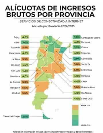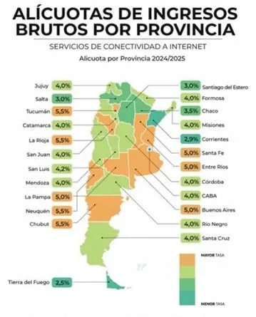 Solo Corrientes con el 2,9% y Tierra del Fuego con 2,5%, reflejan una tasa menor y Salta una alícuota igual a la de Santiago del 3%. Todo el resto de las provincias cobran Ingresos Brutos con alícuotas mayores a las que aplica Santiago del Estero por ejemplo en un rubro clave como lo es el servicio de conectividad a internet.