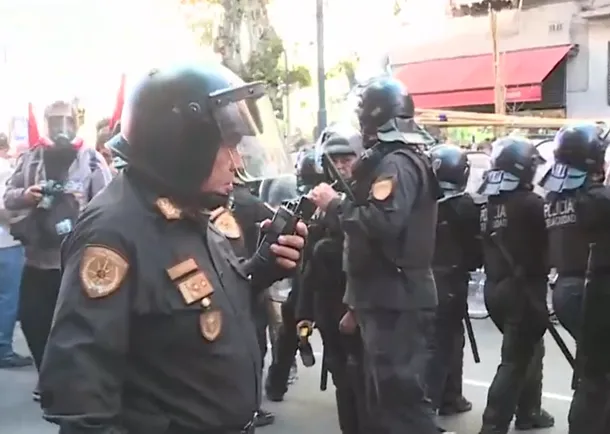Cerca de las 17 un carro hidrante y efectivos de la Policía de la Ciudad comenzaron a movilizarse sobre la Avenida de Mayo y comenzaron a empujar a manifestantes que estaban en la vereda para obligarlos a bajar a la calle y así correrlos, según relató el periodista Nicolás Munafó en C5N.