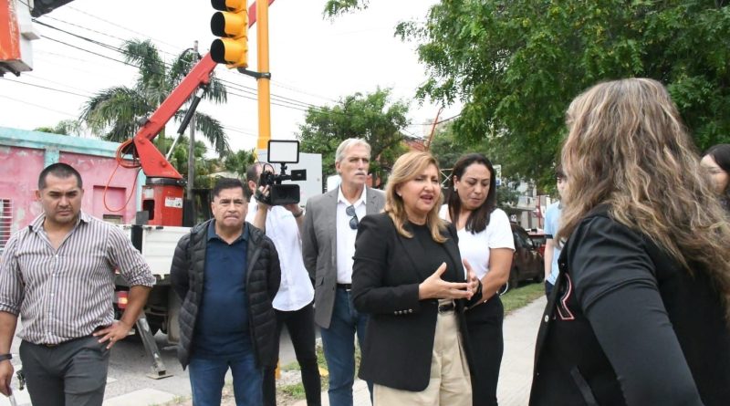 La intendente, Ing. Norma Fuentes, supervisó la instalación de nuevos semáforos en la esquina de las calles Libertad y Santa Fe, con el objetivo de mejorar la seguridad vial y optimizar la circulación del tránsito.