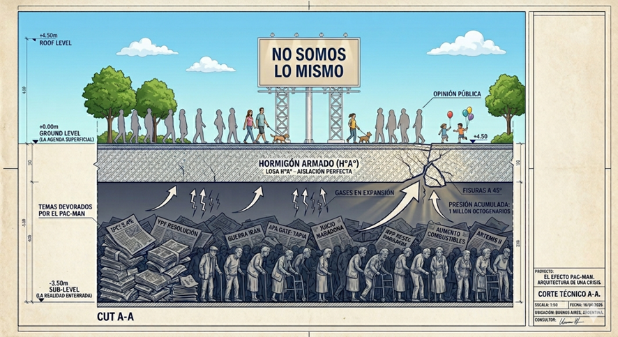Colaboración, Edmundo Fuster. En Argentina, la agenda se ha vuelto un Pac-Man voraz. Mientras nos distraen con la foto de turno, debajo de una losa de H°A° de máxima resistencia se oculta una realidad que asusta: desde el manoteo al Fondo de Garantía de Sustentabilidad hasta un Ministro de Salud que parece ver a nuestros octogenarios como un error de cálculo en su planilla de Excel.